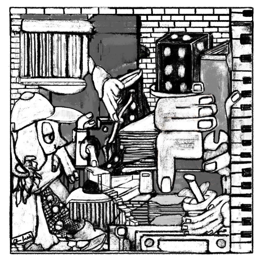 Where does your grind begin? This hand-drawn blueprint is a study in controlled chaos. It captures the internal machinery of a mind locked into the work—the arm emerging from the cracks, the foundation of the boot, and the single finger holding the entire vision upright.